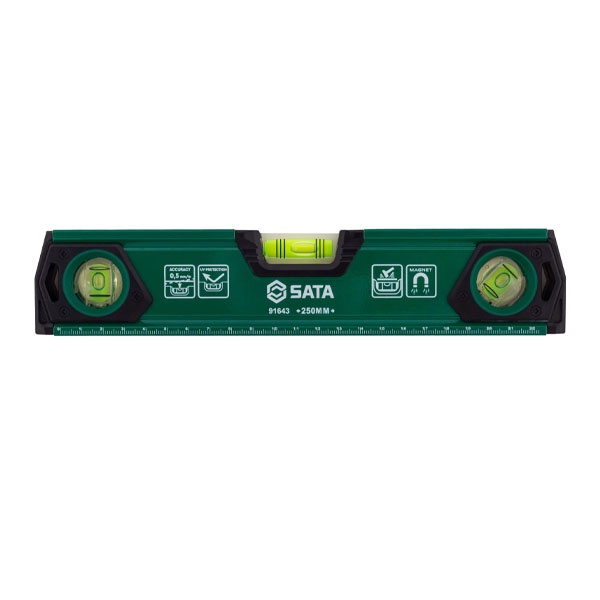 Hệ thống 3 ống thủy tinh xảo: Cho phép đo thăng bằng ngang, đo đứng và góc nghiêng 45 độ. Các lọ thủy được bảo vệ chắc chắn, bọt khí hiển thị rõ nét giúp đọc kết quả nhanh và chính xác.