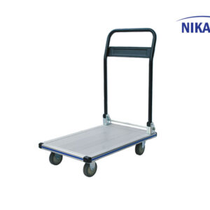 Tay cầm gập gọn tiện dụng: Thiết kế tay đẩy chắc chắn có thể gập phẳng hoàn toàn xuống mặt sàn thông qua cơ chế thanh khóa bằng chân (Foot pedal). Sau khi gập, xe trở nên rất mỏng, dễ dàng cất giữ dưới gầm kệ hoặc mang theo trên xe tải nhỏ.